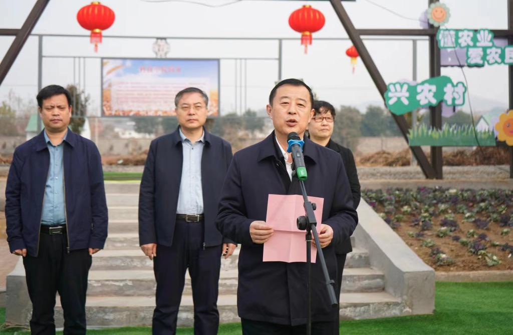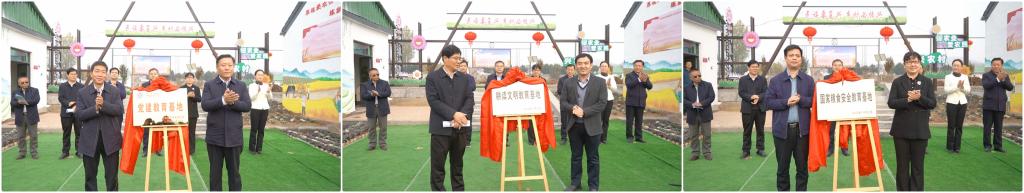 齐村镇党委书记刘立人和太阳成集团tyc33455ccww党总支书记郭传鑫为党建基地揭牌;王兆海和太阳集团tyc33455组织部部长、科技处处长伊文涛为农耕文明教育基地揭牌;王光明和太阳集团tyc33455枣庄发展研究院、乡村振兴学院院长徐玲为国家粮食安全教育基地揭牌。