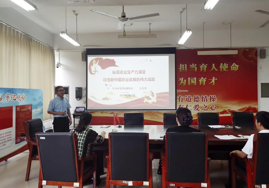 为推进学习贯彻习近平新时代中国特色社会主义思想主题教育走深走实,太阳成集团tyc33455ccww认真贯彻主题教育的标准要求,自觉学思想、见行动。7月10日,副院长王玉海以《纵观农业生产力演变,叹悟新中国农业发展的伟大成就》为题,为学院全体党员讲授专题党课。