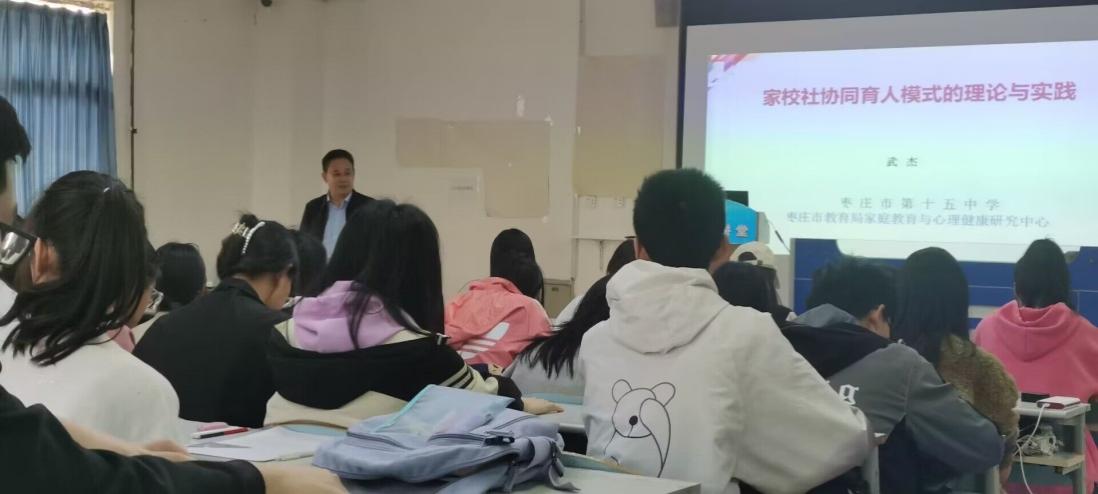3月10日下午,原枣庄市第十五中学南校校长、枣庄市教育局家庭教育与心理健康研究中心专家武杰应邀来我院,为156名师范生讲授《家校合作教育指导》课程。