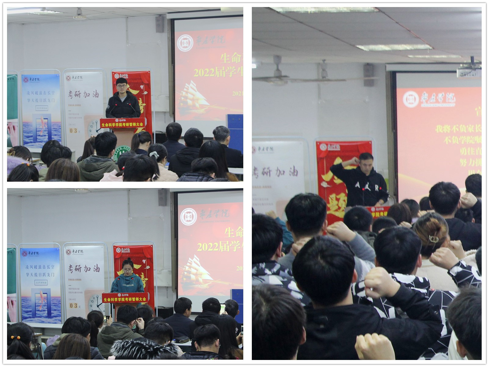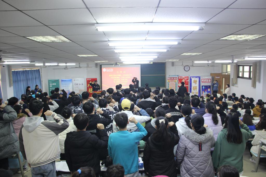 大会上,播放了来自在校生学弟学妹以及往届考研成功学长们的加油视频,李志军同学代表在校生送上对考研学子最真挚的祝福,崔荣慰同学代表全体考研学子感恩学校的培养与关怀,前院学生会主席杨深琳同学带领全体考研学子进行了慷慨激昂的宣誓,表示一定不辜负家长期盼,恩师厚望,勇往直前,决胜考场。