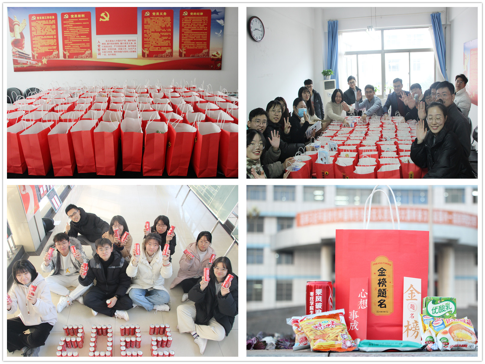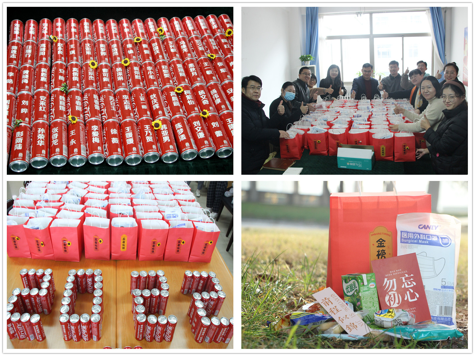 在充满温情的歌声中,一组组考研学子上台接受领导老师们赠送的“金榜题名加油包”,满满的红色福袋里有防疫物资、面包牛奶、还有镌刻每个人名字和寄语的定制可乐。相信这份深情的寄托,在寒冷的冬日里能给考研学子们送上“最温暖”的祝福。