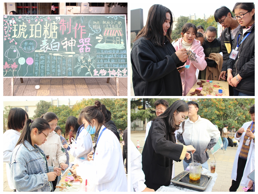 生物协会响应校团委号召,积极组织社团文化月活动,于11月9日在枫院餐厅小广场上举办“琥珀糖”制作活动。