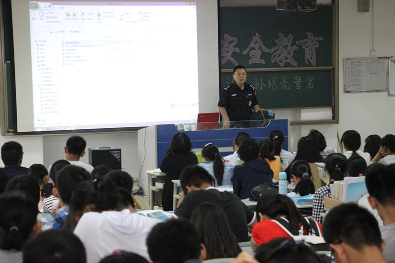 孙警官结合自身工作实际,选取具有代表性的真实案例以案说法,配以案发现场图片、视频,以真实的教训警示大家法制与安全的极端重要性。通过与同学的现场互动,孙警官模拟讲解了实例中的一些动作和行为,提醒同学们要提高警惕,注意自身安全的防护。另外,针对近期出现的一些大学生安全事件,孙警官强调大学生应增强法制观念,提高安全意识,遇到事情冷静处理,戒骄戒躁,切勿心存贪念,加强自身管理,远离传销与电信诈骗,远离毒品。
