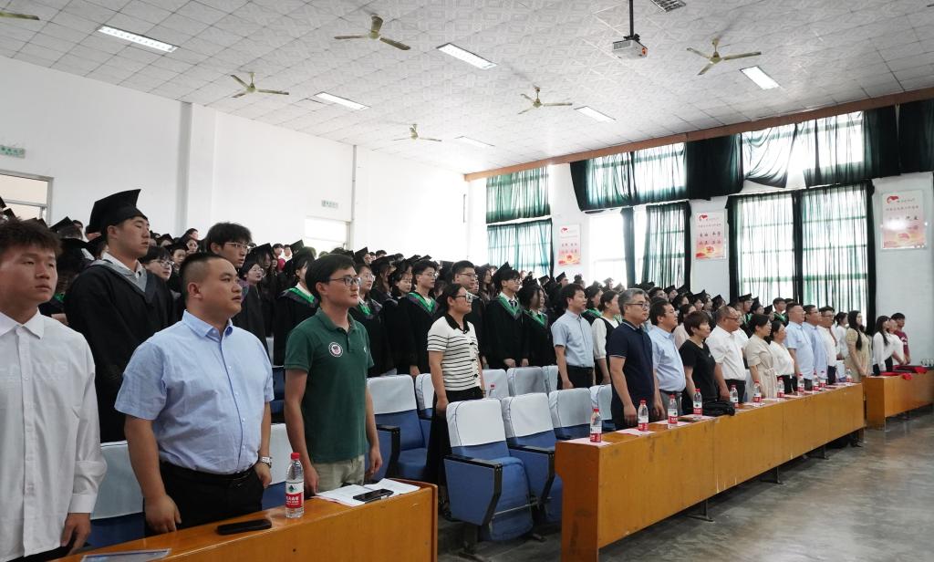 典礼仪式在雄壮的国歌声中拉开帷幕。副院长陈青宣读《关于授予2024届太阳成集团tyc33455ccww本科毕业生学士学位的决定》。随后,获得学士学位的同学们在庄严的音乐声中走上主席台,校党委委员、统战部部长林勇依次为他们拨穗正冠、颁发学士学位证书、赠送学院实验田里的小麦花束并合影留念。