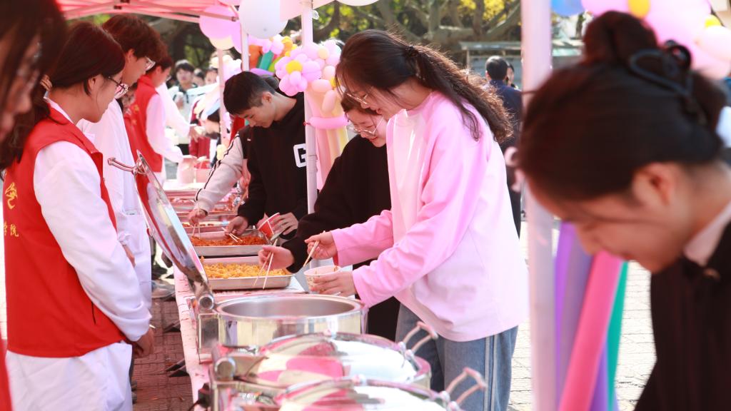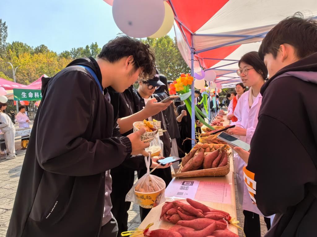 活动现场人头攒动,热闹非凡。在品尝区,新鲜出炉的红薯香气四溢,软糯香甜的金黄薯肉热气腾腾,让人垂涎欲滴。摊位前人头攒动,前来品尝的师生们络绎不绝,各种红薯美食凭借绝佳的口感和独特的魅力,受到广大师生的广泛好评和大庆赞誉;在展销区,包括哈密冰糖薯、济薯26、西瓜红蜜薯、榴莲蜜薯、烟薯25等一筐筐新鲜出土的红薯以其饱满的外形、鲜艳的色泽吸引着众人的目光。参与者纷纷选购,希望将冬季的第一份甜蜜和温暖积极与朋友及家人分享。