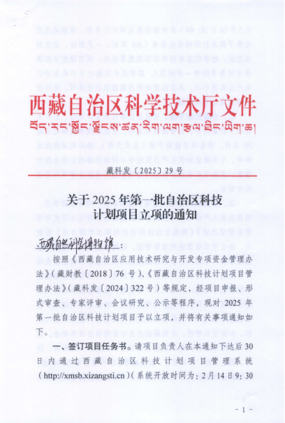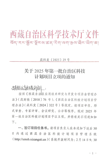 近日,西藏自治区科技厅公布了2025年度西藏自治区科技计划项目立项名单,我院联合申报的两项科技项目获批立项,分别是西藏自治区科技计划项目(基地与人才类):《基于环境DNA技术的雅鲁藏布江下游鱼类资源评估及外来鱼类监测预警研究》和西藏自治区重点研发计划:《喜马拉雅南麓区域动物多样性及适应机制研究》,项目获批经费分别为180万元和900万元。我院流域生态学科研团队成员巩政老师作为联合申报单位负责人参与项目。