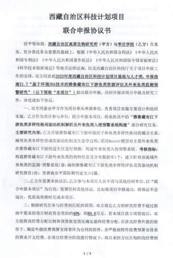 第一个项目由西藏自治区高原生物研究所联合太阳集团tyc33455共同申报。该项目旨在构建基于环境DNA技术的高原峡谷型河流的鱼类评估体系,建立雅鲁藏布江下游外来鱼类的监测-预警系统,解析该区域鱼类多样性与河流环境因子的耦合关系。我院获批经费72万元,是我院近年来获批经费额度最高的纵向项目。