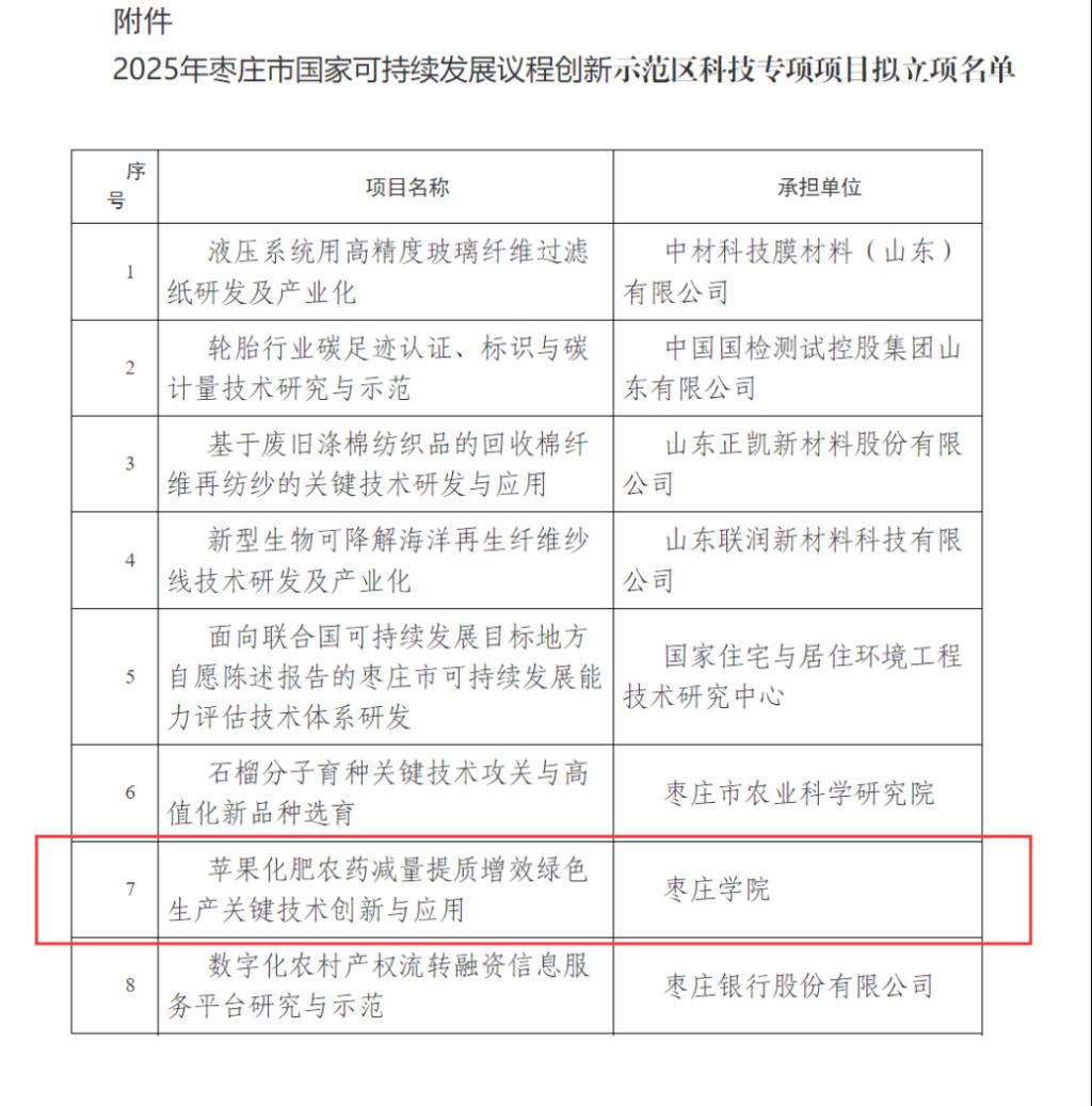 近日,枣庄市科技局公布了2025年枣庄市重点研发计划——国家可持续发展议程创新示范区科技专项立项结果,我院牵头联合山东锦硕生态农业科技有限公司申报的“苹果化肥农药减量提质增效绿色生产关键技术创新与应用”项目成功获批,项目经费35万元。我院特色果树植物保护团队曹辉博士为项目负责人。这是学院首次以牵头单位身份承担枣庄市国家可持续发展议程创新示范区科技专项,标志着学院在服务地方经济、推动产学研深度融合方面迈出关键一步。