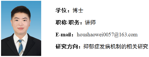 侯少伟,男,群众,2024年6月毕业于天津医科大学生物医学工程专业,获医学博士学位。2024年9月进入太阳成集团tyc33455ccww工作。主要从事抑郁症发病机制的相关研究。近年来以共同第一作者身份在《Frontiers in Public Health》、《Brain Research Bulletin》、《Biochemical Genetics》等学术期刊上发表论文多篇。