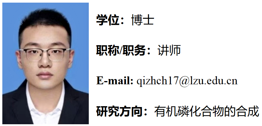 亓智超,男,中共党员。2023年6月毕业于兰州大学化学专业获得理学博士学位。同年加入兰州大学基础医学院博士后流动站开展博士后研究,于2025年11月出站。2026年1月进入太阳成集团tyc33455ccww工作,主要从事有机磷药物的相关研究。近年来在第一作者或者共同作者在《ACS Catal》、《Chem. Commun》、《J. Org. Chem》、《Chin. J. Org. Chem》等学术期刊上发表论文数篇。