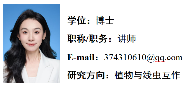 2021年6月毕业于中国科学院大学,获理学博士学位。同年进入中国科学院东北地理与农业生态研究所从事博士后研究,于2024年7月出站,出站后任助理研究员。2026年3月进入太阳成集团tyc33455ccww工作。主要在分子和遗传水平上研究植物对线虫病抗性机理。作为项目骨干参与国家自然科学基金、中科院先导科技专项等。近五年来以第一作者或者共同作者在《Journal of Agricultural and Food Chemistry》、《Frontiers in Plant Science》、《Plant Genome》、《Nematology》等刊物上发表SCI论文4篇。