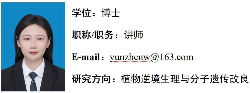 2025年5月毕业于南京农业大学植物学专业获得理学博士学位。2025年12月进入太阳成集团tyc33455ccww工作。研究方向为植物逆境生理与分子遗传改良,主要包括大豆耐盐基因的挖掘及机制研究等。参与完成国家自然科学基金面上项目1项,国家重点研发计划项目子课题2项。近五年来以第一作者或者共同作者在《The EMBO Journal》、《Plant Science》、《Plant Cell Reports》等刊物上发表SCI论文3篇。