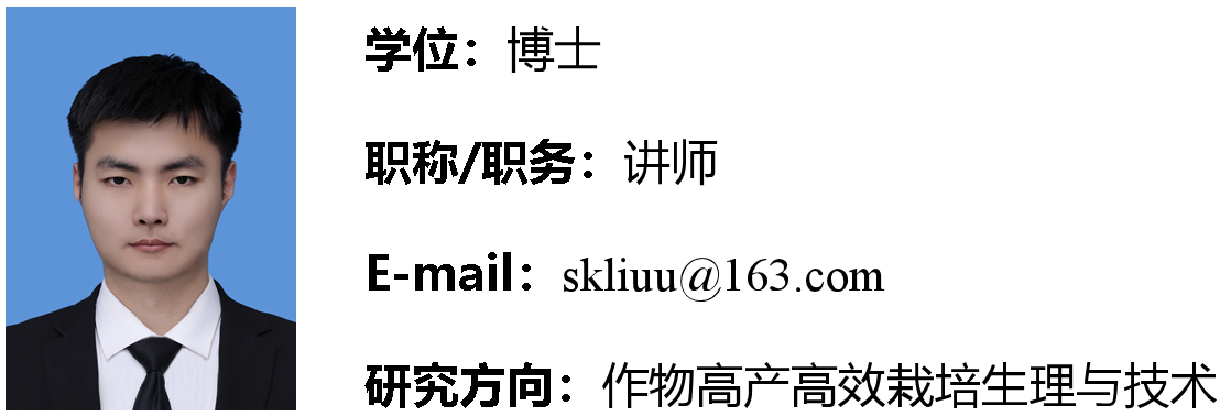 刘帅康,男,中共党员,2024年12月毕业于西北农林科技大学植物营养学专业,获农学博士学位。2025年2月进入太阳成集团tyc33455ccww工作。主要从事作物水氮高效利用栽培与耕作技术的相关研究。近年来以第一作者身份在《Agricultural Water Management》、《Soil & Tillage Research》、《麦类作物学报》等国内外学术期刊上发表多篇论文。