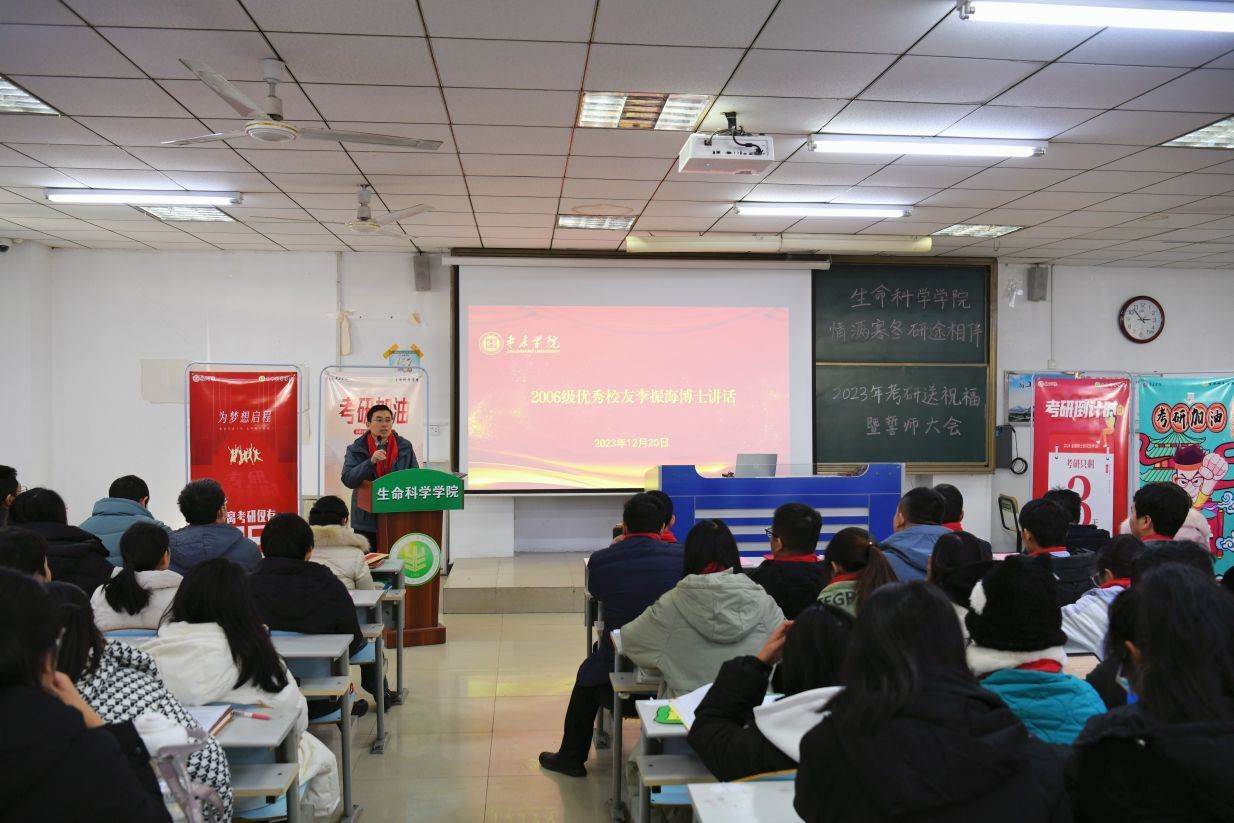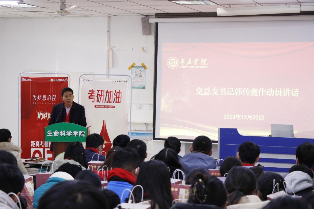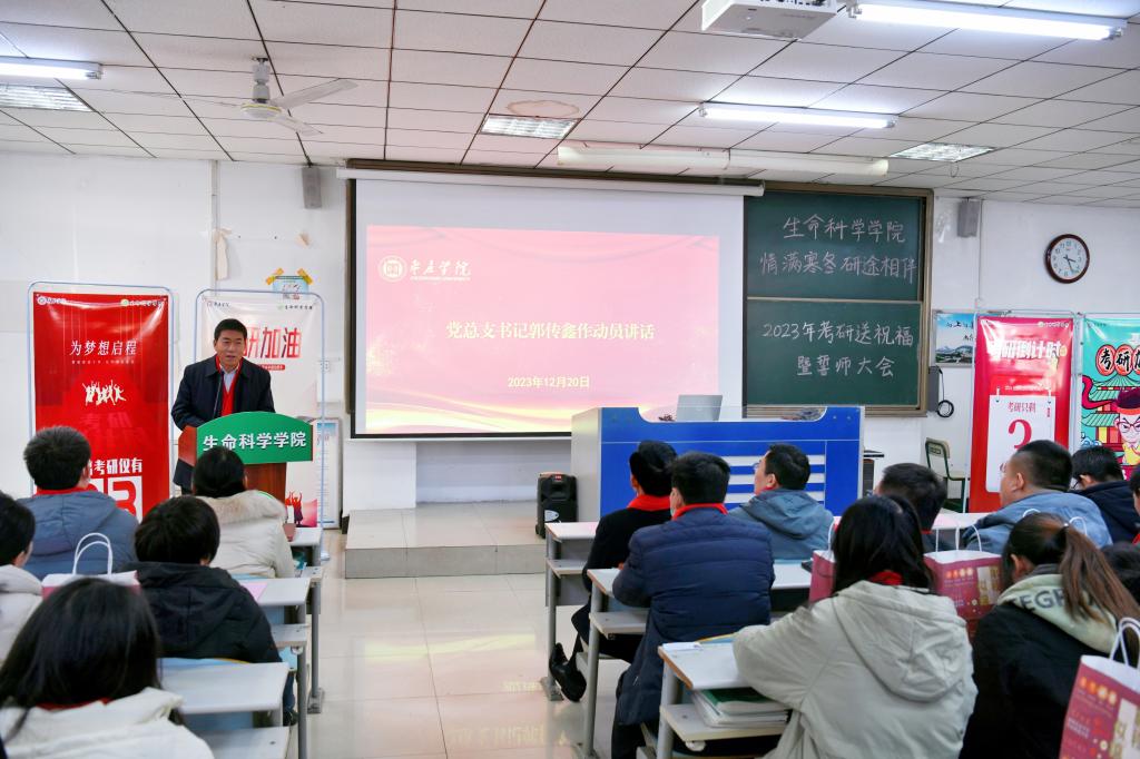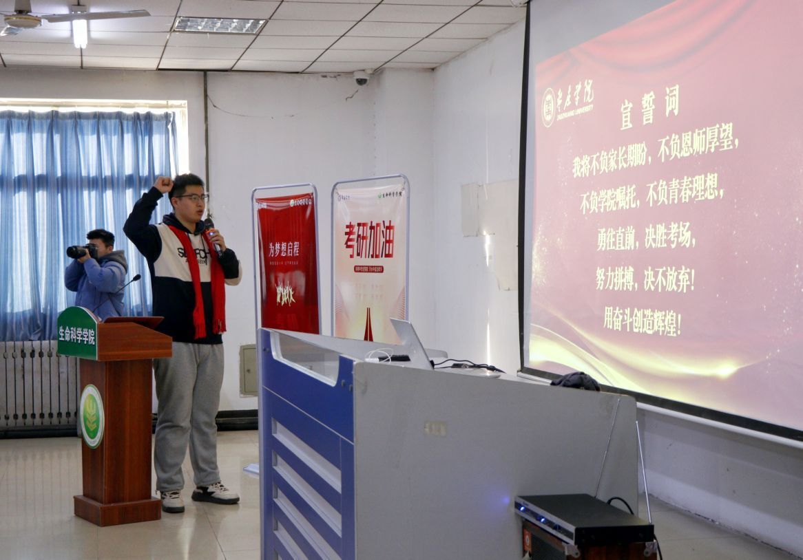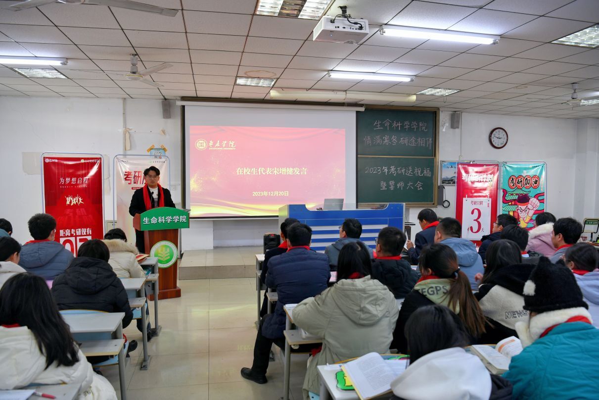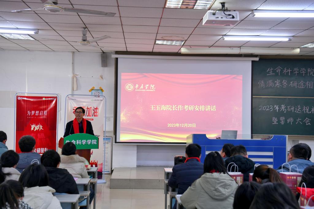 王玉海院长在考研安排讲话中用一首小诗《采桑子·考研动员》表达了对学子们考研后即将离开生科的不舍,对同学们一战成功的美好祝愿,充分肯定了每一位考研学子逐梦前行所付出的汗水和努力,希望考研学子在考研最后的紧要关头,迎难而上、踔厉奋发、勇毅前行。