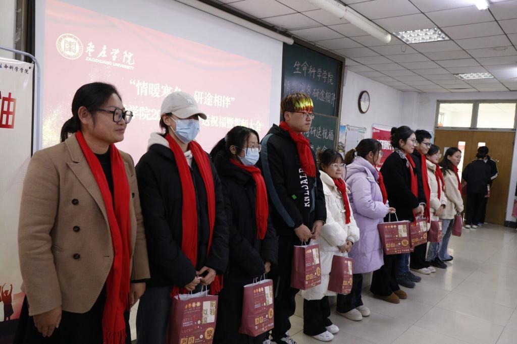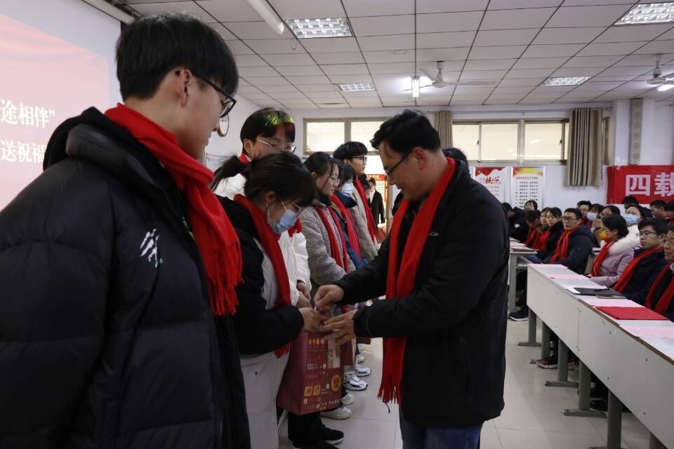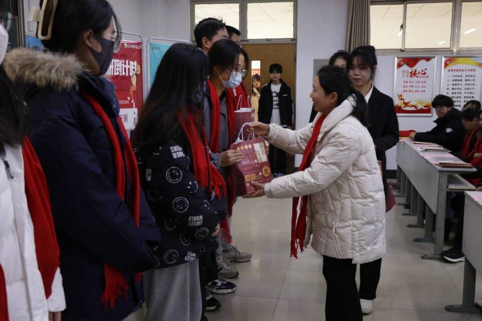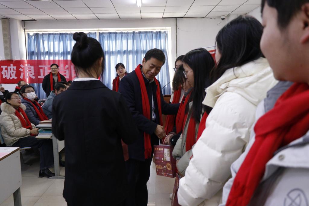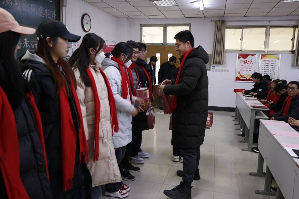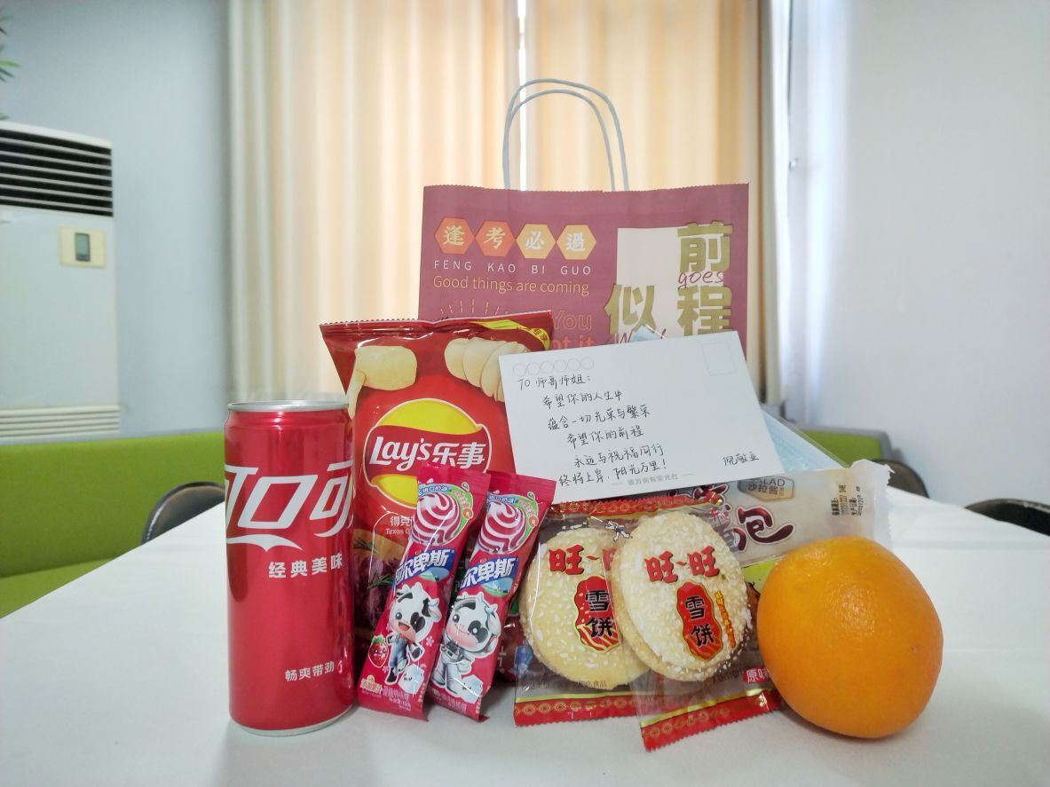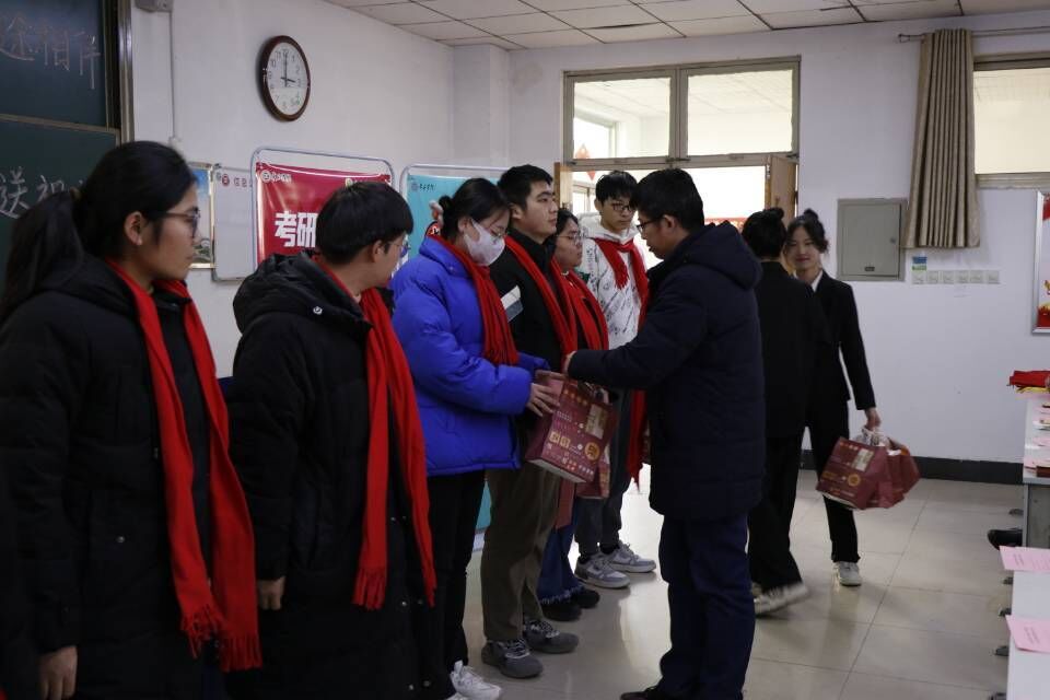 学院领导老师为考研学生分发考研“暖心加油大礼包”。现场气氛热烈而温馨,“薯”你最行、数你最“棒”、“包”你上岸、心想事“橙”!……一件件充满寓意和希望的小礼品,一句句坚定温暖的祝福话语,为他们送去了冬日里的温暖关怀。