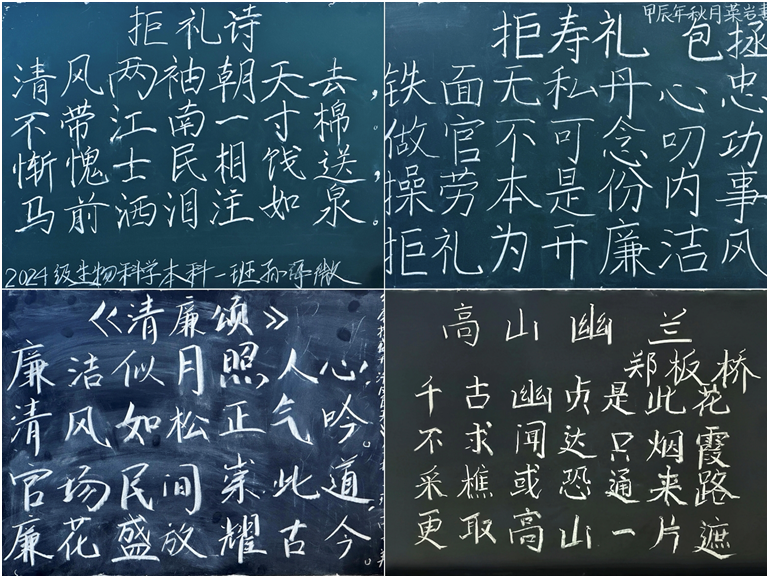 此次比赛作品题材广泛、内容丰富,展现了学生们对廉洁文化的深刻理解和独特创意。参赛同学通过板书与粉笔字的形式,呈现出经典文学作品如《拒礼诗》等,字迹大气磅礴,气势恢宏,生动展现了其中蕴含的豪迈气概。这些作品不仅让同学们在创作过程中近距离接触廉洁文化,更深刻领悟了廉洁自律的核心理念。