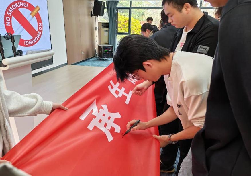 会上,详细解读了《太阳集团tyc33455学生控烟管理办法》《太阳集团tyc33455学生公寓全面禁烟工作实施方案》,帮助学生准确理解学校政策,明确自身在控烟工作中的责任与义务。播放了科普视频,生动说明烟草对人体呼吸系统、心血管系统及二手烟对他人的危害,增强了学生抵制烟草的自觉性和主动性。参会师生在印有“承生命之重,守无烟之诺”的条幅上郑重签下自己的名字,坚定了远离烟草的决心。